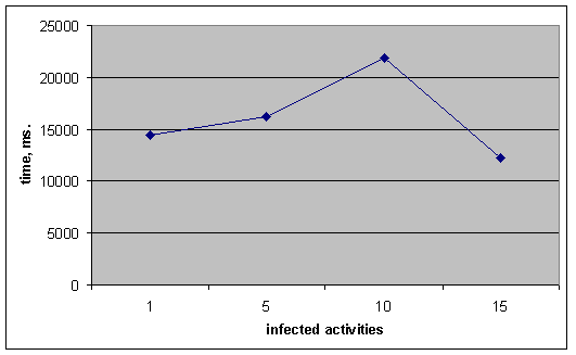 The full table with evaluation results (in Excel format) can be accessed here. 1.The first set of test shows how the time required to calculate a repair plan depends on the amount of activities within the work flow. The table represents these results: The corresponding work flows generated within this test are accessible here. 2.The second set of test shows how the time required to calculate a repair plan depends on the amount of objects within the work flow. The table represents these results: The corresponding work flows generated within this test are accessible here. 3.The third set of test shows how the time required to calculate a repair plan depends on the amount of choosing blocks (XOR-splits) within the work flow. The table represents these results: The corresponding work flows generated within this test are accessible here. 4.The fourth set of test shows how the time required to calculate a repair plan depends on the amount of infected activities within the executed part of the work flow. The table represents these results: The corresponding work flows generated within this test are accessible here. The results show that our approach is feasible for the medium sized orchestrated web service used in practice. |