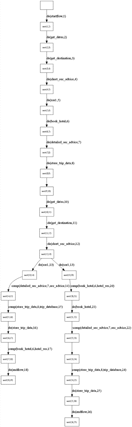 The input to our example WF is a trip database, provided by the activity STARTFLOW which initializes also all other WF objects. An employee inputs trip data and a security agent immediately performs the activity short security advice returning standard security advice. Since the trip takes longer than a day, a hotel is booked and detailed security advice is generated. Then, the trip database is updated. Let us assume an exception is thrown after the trip data was stored (before ENDFLOW is executed) and a diagnosis indicates that the activity get dates is transiently faulty. The repair plan generated by our repair system for this case can be represented as following (click to enlarge): ![]() This plans the sequence of repair actions which must be applied to the faulty work flow. Time points 1 to 9 represent the original work flow execution. Which means that at the time point 9 a fault was detected and diagnosed. The repair begins at the time moment 10. Activity get_dates can be simply redone, because it does not read any object and was not blamed by the diagnoser as a permanently faulty activity. The repair plan shows that at time moments 11 and 12 there is no need to redo activities get_destination and short_sec_advice - they were executed correctly and do not depend (by any data dependency) on any faulty activity or data produced by a faulty or a faulty executed activity. So, such objects as destination and security_advice can be simply reused. The XOR choosing block used the state of the object destination which was produced by a faulty activity. Which means that now this XOR split must be redone. It is possible because the new correct state of the object duration was obtained at the time moment 10. Redoing the XOR choosing block at the time point 13 results in the branching within the repair plan. Time points 14 till 18 correspond to the case when duration is lower that 1 day, and time points 20 till 26 correspond to the case when duration of the trip is greather than 1 day (and according to the work flow definition the hotel must be booked and the new detailed security advice obtained). In the case when the trip will take not longer than a day, no hotel is needed and no detailed security advice must be obtained. But during the original work flow execution it was already done. That's why at time points 14, 15 and 17 these actions have to be compensated (which means to cancel the hotel reservation, delete the information about the security advice and restore the trip data). The data about the trip must be restored at the time point 17 in order to make the redoing of the store_trip_data activity possible - this activity reads and affects the trip_database which was incorrectly chaged during the original work flow execution at time moment 8. In the case when the trip will take longer than a day, the hotel reservation must be done and detailed security advice must be obtained. These actions were originally done during the original work flow execution. But not all of them can be reused: the hotel was booked using the incorrect information about the duration of the trip. That's why this booking has to be canceled at the time point 20 and the new booking performed at time point 21. But for obtaining the detailed security advice only destination and the short security advice were used. They both were not infected according to the data dependencies within the work flow. That's why there is no need to compensate detailed_sec_advice at time point 22. The data about the trip must be retored because of the same reasons as it was done at time point 17. As we see, executing this repair plan will eliminate several redundant repair actions (at time points 11,12,22 and 23) and will guarantee that at the end of the work flow execution (in both cases of the XOR split) all objects will have correct states. |