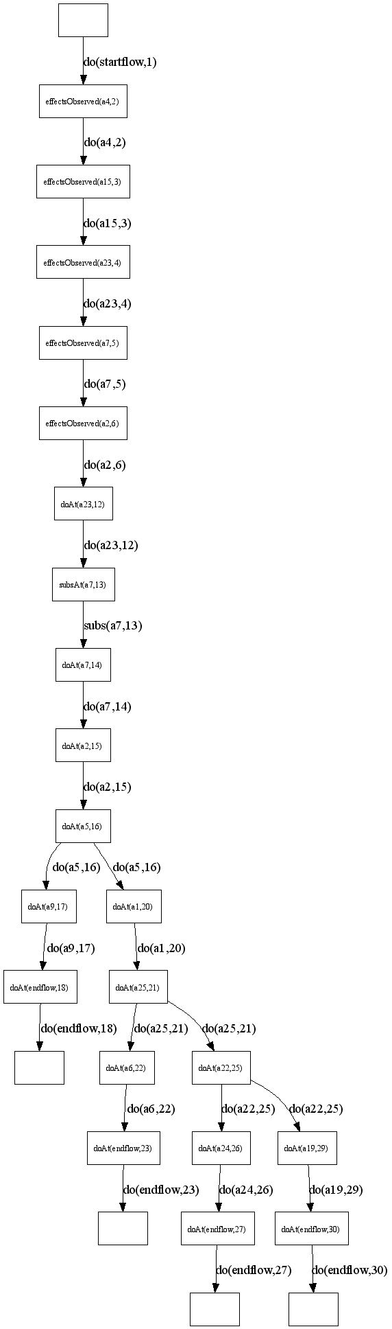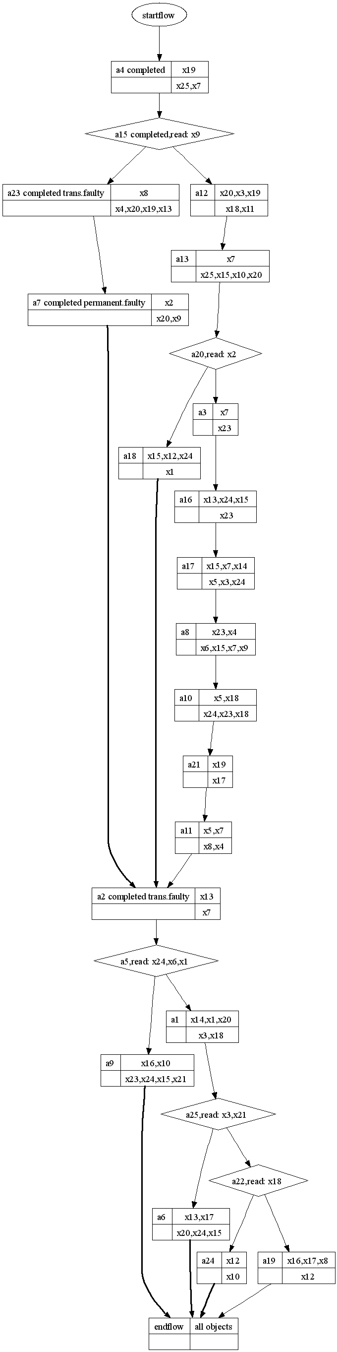 ExamplesIn order to show the correctness of our approach we have tested it on the hunderds of randomly generated work flows. For each of them a diagnosis, an initial execution and states of objects were generated also randomly. The repair system was applied to generate a repair plan. The execution of the obtained repair plan was simulated using a work flow simulator. It simulates a privitive business logic behind each activity. The results (states of objects) were compared to the results obtained from the simulation of the normal work flow execution. As we see from the execution logs these results are equal. It proves the correctness of our approach.The folder with the "trip planning" example and random-generated work flows can be accessed from here. Each sub-folder contains: